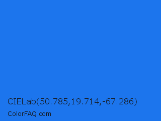 CIELab 50.785,19.714,-67.286 Color is a normal blue color and the nearest color is Blue Crayola #1f75fe. Hex code #1c75ed and RGB value is rgb(28,117,237). In RGB color space, this color is composed of 11% red, 46% green, 93% blue, In CMYK color space, this color is composed of 88% cyan, 51% magenta, 0% yellow , 7% black , In HSL color space, this color has a hue angle of 214° , 85% saturation and 52% lightness.
