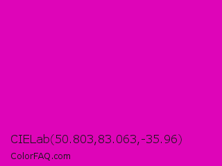 CIELab 50.803,83.063,-35.96 Color is a normal magenta color and the nearest color is Deep Magenta #cc00cc. Hex code #de05b8 and RGB value is rgb(222,5,184). In RGB color space, this color is composed of 87% red, 2% green, 72% blue, In CMYK color space, this color is composed of 0% cyan, 98% magenta, 17% yellow , 13% black , In HSL color space, this color has a hue angle of 311° , 96% saturation and 45% lightness.