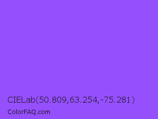 CIELab 50.809,63.254,-75.281 Color is a light violet color and the nearest color is Navy Purple #9457eb. Hex code #964ffc and RGB value is rgb(150,79,252). In RGB color space, this color is composed of 59% red, 31% green, 99% blue, In CMYK color space, this color is composed of 40% cyan, 69% magenta, 0% yellow , 1% black , In HSL color space, this color has a hue angle of 265° , 97% saturation and 65% lightness.