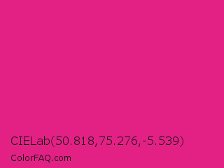 CIELab 50.818,75.276,-5.539 Color is a normal rose color and the nearest color is Barbie Pink #e0218a. Hex code #e32185 and RGB value is rgb(227,33,133). In RGB color space, this color is composed of 89% red, 13% green, 52% blue, In CMYK color space, this color is composed of 0% cyan, 85% magenta, 41% yellow , 11% black , In HSL color space, this color has a hue angle of 329° , 78% saturation and 51% lightness.