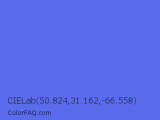 CIELab 50.824,31.162,-66.558 Color is a light blue color and the nearest color is Very Light Blue #6666ff. Hex code #596dec and RGB value is rgb(89,109,236). In RGB color space, this color is composed of 35% red, 43% green, 93% blue, In CMYK color space, this color is composed of 62% cyan, 54% magenta, 0% yellow , 7% black , In HSL color space, this color has a hue angle of 232° , 79% saturation and 64% lightness.