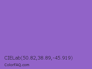 CIELab 50.82,38.89,-45.919 Color is a normal violet color and the nearest color is Amethyst #9966cc. Hex code #9163c8 and RGB value is rgb(145,99,200). In RGB color space, this color is composed of 57% red, 39% green, 78% blue, In CMYK color space, this color is composed of 28% cyan, 51% magenta, 0% yellow , 22% black , In HSL color space, this color has a hue angle of 267° , 48% saturation and 59% lightness.