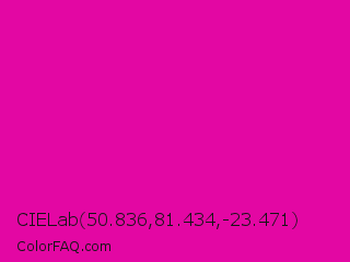 CIELab 50.836,81.434,-23.471 Color is a normal magenta color and the nearest color is Hollywood Cerise #f400a1. Hex code #e307a3 and RGB value is rgb(227,7,163). In RGB color space, this color is composed of 89% red, 3% green, 64% blue, In CMYK color space, this color is composed of 0% cyan, 97% magenta, 28% yellow , 11% black , In HSL color space, this color has a hue angle of 317° , 94% saturation and 46% lightness.