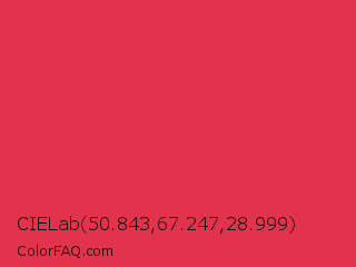 CIELab 50.843,67.247,28.999 Color is a normal red color and the nearest color is Amaranth #e52b50. Hex code #e3324c and RGB value is rgb(227,50,76). In RGB color space, this color is composed of 89% red, 20% green, 30% blue, In CMYK color space, this color is composed of 0% cyan, 78% magenta, 67% yellow , 11% black , In HSL color space, this color has a hue angle of 351° , 76% saturation and 54% lightness.