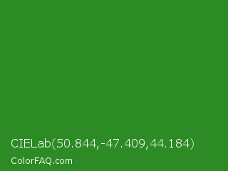 CIELab 50.844,-47.409,44.184 Color is a normal green color and the nearest color is Forest Green #228b22. Hex code #2c8b25 and RGB value is rgb(44,139,37). In RGB color space, this color is composed of 17% red, 55% green, 15% blue, In CMYK color space, this color is composed of 68% cyan, 0% magenta, 73% yellow , 45% black , In HSL color space, this color has a hue angle of 116° , 58% saturation and 35% lightness.