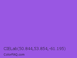 CIELab 50.844,53.854,-61.195 Color is a light violet color and the nearest color is Navy Purple #9457eb. Hex code #9957e3 and RGB value is rgb(153,87,227). In RGB color space, this color is composed of 60% red, 34% green, 89% blue, In CMYK color space, this color is composed of 33% cyan, 62% magenta, 0% yellow , 11% black , In HSL color space, this color has a hue angle of 268° , 71% saturation and 62% lightness.