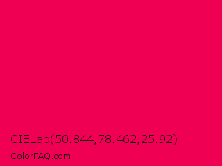 CIELab 50.844,78.462,25.92 Color is a normal rose color and the nearest color is Folly #ff004f. Hex code #f00052 and RGB value is rgb(240,0,82). In RGB color space, this color is composed of 94% red, 0% green, 32% blue, In CMYK color space, this color is composed of 0% cyan, 100% magenta, 66% yellow , 6% black , In HSL color space, this color has a hue angle of 340° , 100% saturation and 47% lightness.