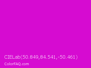 CIELab 50.849,84.541,-50.461 Color is a normal magenta color and the nearest color is Deep Magenta #cc00cc. Hex code #d60bd1 and RGB value is rgb(214,11,209). In RGB color space, this color is composed of 84% red, 4% green, 82% blue, In CMYK color space, this color is composed of 0% cyan, 95% magenta, 2% yellow , 16% black , In HSL color space, this color has a hue angle of 301° , 90% saturation and 44% lightness.