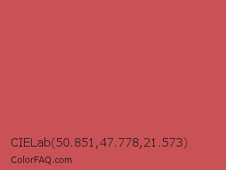 CIELab 50.851,47.778,21.573 Color is a normal red color and the nearest color is Fuzzy Wuzzy Brown #c45655. Hex code #c95257 and RGB value is rgb(201,82,87). In RGB color space, this color is composed of 79% red, 32% green, 34% blue, In CMYK color space, this color is composed of 0% cyan, 59% magenta, 57% yellow , 21% black , In HSL color space, this color has a hue angle of 357° , 52% saturation and 55% lightness.