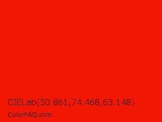 CIELab 50.861,74.468,63.148 Color is a normal red color and the nearest color is Scarlet #ff2400. Hex code #f01705 and RGB value is rgb(240,23,5). In RGB color space, this color is composed of 94% red, 9% green, 2% blue, In CMYK color space, this color is composed of 0% cyan, 90% magenta, 98% yellow , 6% black , In HSL color space, this color has a hue angle of 5° , 96% saturation and 48% lightness.