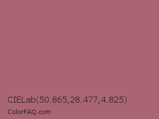 CIELab 50.865,28.477,4.825 Color is a normal red color and the nearest color is Coral Tree #a86b6b. Hex code #a96672 and RGB value is rgb(169,102,114). In RGB color space, this color is composed of 66% red, 40% green, 45% blue, In CMYK color space, this color is composed of 0% cyan, 40% magenta, 33% yellow , 34% black , In HSL color space, this color has a hue angle of 349° , 28% saturation and 53% lightness.