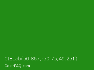 CIELab 50.867,-50.75,49.251 Color is a normal green color and the nearest color is Forest Green #228b22. Hex code #228c16 and RGB value is rgb(34,140,22). In RGB color space, this color is composed of 13% red, 55% green, 9% blue, In CMYK color space, this color is composed of 76% cyan, 0% magenta, 84% yellow , 45% black , In HSL color space, this color has a hue angle of 114° , 73% saturation and 32% lightness.