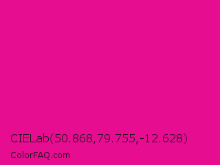 CIELab 50.868,79.755,-12.628 Color is a normal magenta color and the nearest color is Barbie Pink #e0218a. Hex code #e60d91 and RGB value is rgb(230,13,145). In RGB color space, this color is composed of 90% red, 5% green, 57% blue, In CMYK color space, this color is composed of 0% cyan, 94% magenta, 37% yellow , 10% black , In HSL color space, this color has a hue angle of 324° , 89% saturation and 48% lightness.