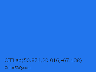CIELab 50.874,20.016,-67.138 Color is a normal blue color and the nearest color is Blue Crayola #1f75fe. Hex code #2175ed and RGB value is rgb(33,117,237). In RGB color space, this color is composed of 13% red, 46% green, 93% blue, In CMYK color space, this color is composed of 86% cyan, 51% magenta, 0% yellow , 7% black , In HSL color space, this color has a hue angle of 215° , 85% saturation and 53% lightness.