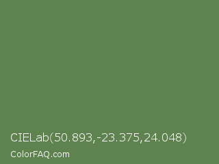 CIELab 50.893,-23.375,24.048 Color is a normal green color and the nearest color is Hippie Green #53824b. Hex code #5e834f and RGB value is rgb(94,131,79). In RGB color space, this color is composed of 37% red, 51% green, 31% blue, In CMYK color space, this color is composed of 28% cyan, 0% magenta, 40% yellow , 49% black , In HSL color space, this color has a hue angle of 103° , 25% saturation and 41% lightness.