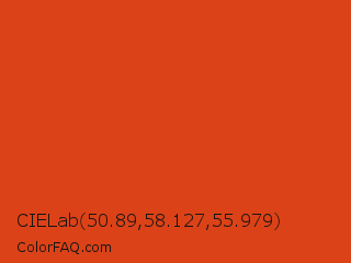CIELab 50.89,58.127,55.979 Color is a normal red color and the nearest color is Vermilion #d9381e. Hex code #dc4217 and RGB value is rgb(220,66,23). In RGB color space, this color is composed of 86% red, 26% green, 9% blue, In CMYK color space, this color is composed of 0% cyan, 70% magenta, 90% yellow , 14% black , In HSL color space, this color has a hue angle of 13° , 81% saturation and 48% lightness.