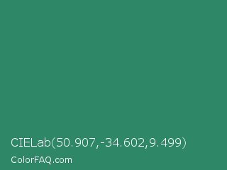 CIELab 50.907,-34.602,9.499 Color is a normal green color and the nearest color is Eucalyptus #278a5b. Hex code #2e8868 and RGB value is rgb(46,136,104). In RGB color space, this color is composed of 18% red, 53% green, 41% blue, In CMYK color space, this color is composed of 66% cyan, 0% magenta, 24% yellow , 47% black , In HSL color space, this color has a hue angle of 159° , 49% saturation and 36% lightness.