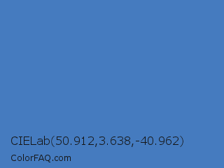 CIELab 50.912,3.638,-40.962 Color is a normal blue color and the nearest color is Cyan Blue Azure #4682bf. Hex code #457bbf and RGB value is rgb(69,123,191). In RGB color space, this color is composed of 27% red, 48% green, 75% blue, In CMYK color space, this color is composed of 64% cyan, 36% magenta, 0% yellow , 25% black , In HSL color space, this color has a hue angle of 213° , 49% saturation and 51% lightness.