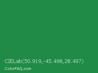 CIELab 50.919,-45.498,28.497 Color is a normal green color and the nearest color is Eucalyptus #278a5b. Hex code #1f8b46 and RGB value is rgb(31,139,70). In RGB color space, this color is composed of 12% red, 55% green, 27% blue, In CMYK color space, this color is composed of 78% cyan, 0% magenta, 50% yellow , 45% black , In HSL color space, this color has a hue angle of 142° , 64% saturation and 33% lightness.