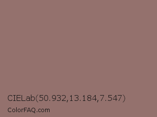 CIELab 50.932,13.184,7.547 Color is a normal red color and the nearest color is Opium #8e6f70. Hex code #94716d and RGB value is rgb(148,113,109). In RGB color space, this color is composed of 58% red, 44% green, 43% blue, In CMYK color space, this color is composed of 0% cyan, 24% magenta, 26% yellow , 42% black , In HSL color space, this color has a hue angle of 6° , 15% saturation and 50% lightness.