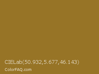 CIELab 50.932,5.677,46.143 Color is a normal orange color and the nearest color is Sand Dune #967117. Hex code #977426 and RGB value is rgb(151,116,38). In RGB color space, this color is composed of 59% red, 45% green, 15% blue, In CMYK color space, this color is composed of 0% cyan, 23% magenta, 75% yellow , 41% black , In HSL color space, this color has a hue angle of 41° , 60% saturation and 37% lightness.