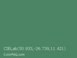 CIELab 50.933,-26.739,11.421 Color is a normal green color and the nearest color is Como #517c66. Hex code #4b8565 and RGB value is rgb(75,133,101). In RGB color space, this color is composed of 29% red, 52% green, 40% blue, In CMYK color space, this color is composed of 44% cyan, 0% magenta, 24% yellow , 48% black , In HSL color space, this color has a hue angle of 147° , 28% saturation and 41% lightness.