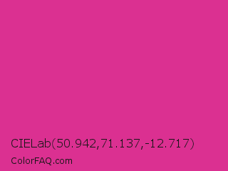 CIELab 50.942,71.137,-12.717 Color is a normal magenta color and the nearest color is Cerise #da3287. Hex code #db3091 and RGB value is rgb(219,48,145). In RGB color space, this color is composed of 86% red, 19% green, 57% blue, In CMYK color space, this color is composed of 0% cyan, 78% magenta, 34% yellow , 14% black , In HSL color space, this color has a hue angle of 326° , 70% saturation and 52% lightness.