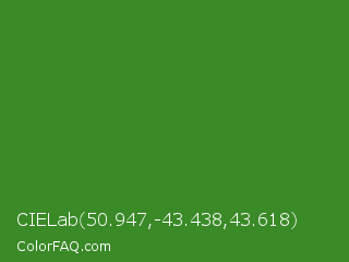 CIELab 50.947,-43.438,43.618 Color is a normal green color and the nearest color is La Palma #368716. Hex code #3a8a27 and RGB value is rgb(58,138,39). In RGB color space, this color is composed of 23% red, 54% green, 15% blue, In CMYK color space, this color is composed of 58% cyan, 0% magenta, 72% yellow , 46% black , In HSL color space, this color has a hue angle of 108° , 56% saturation and 35% lightness.