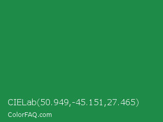 CIELab 50.949,-45.151,27.465 Color is a normal green color and the nearest color is Eucalyptus #278a5b. Hex code #1f8b48 and RGB value is rgb(31,139,72). In RGB color space, this color is composed of 12% red, 55% green, 28% blue, In CMYK color space, this color is composed of 78% cyan, 0% magenta, 48% yellow , 45% black , In HSL color space, this color has a hue angle of 143° , 64% saturation and 33% lightness.