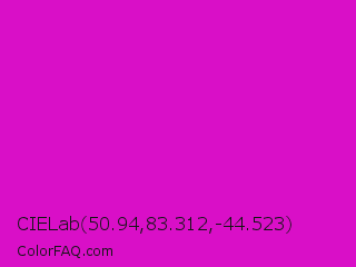 CIELab 50.94,83.312,-44.523 Color is a normal magenta color and the nearest color is Deep Magenta #cc00cc. Hex code #d90fc7 and RGB value is rgb(217,15,199). In RGB color space, this color is composed of 85% red, 6% green, 78% blue, In CMYK color space, this color is composed of 0% cyan, 93% magenta, 8% yellow , 15% black , In HSL color space, this color has a hue angle of 305° , 87% saturation and 45% lightness.