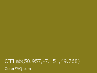 CIELab 50.957,-7.151,49.768 Color is a normal yellow color and the nearest color is Trendy Green #7c881a. Hex code #857b1b and RGB value is rgb(133,123,27). In RGB color space, this color is composed of 52% red, 48% green, 11% blue, In CMYK color space, this color is composed of 0% cyan, 8% magenta, 80% yellow , 48% black , In HSL color space, this color has a hue angle of 54° , 66% saturation and 31% lightness.