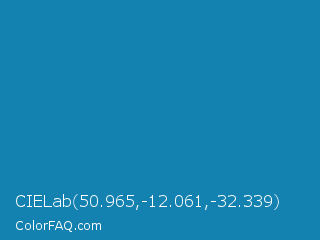 CIELab 50.965,-12.061,-32.339 Color is a normal blue color and the nearest color is Cyan Cornflower Blue #188bc2. Hex code #1382b0 and RGB value is rgb(19,130,176). In RGB color space, this color is composed of 7% red, 51% green, 69% blue, In CMYK color space, this color is composed of 89% cyan, 26% magenta, 0% yellow , 31% black , In HSL color space, this color has a hue angle of 198° , 81% saturation and 38% lightness.
