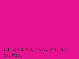 CIELab 50.965,79.075,-11.281 Color is a normal magenta color and the nearest color is Barbie Pink #e0218a. Hex code #e6128f and RGB value is rgb(230,18,143). In RGB color space, this color is composed of 90% red, 7% green, 56% blue, In CMYK color space, this color is composed of 0% cyan, 92% magenta, 38% yellow , 10% black , In HSL color space, this color has a hue angle of 325° , 85% saturation and 49% lightness.