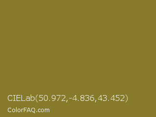 CIELab 50.972,-4.836,43.452 Color is a normal yellow color and the nearest color is Spanish Bistre #807532. Hex code #877a2b and RGB value is rgb(135,122,43). In RGB color space, this color is composed of 53% red, 48% green, 17% blue, In CMYK color space, this color is composed of 0% cyan, 10% magenta, 68% yellow , 47% black , In HSL color space, this color has a hue angle of 52° , 52% saturation and 35% lightness.