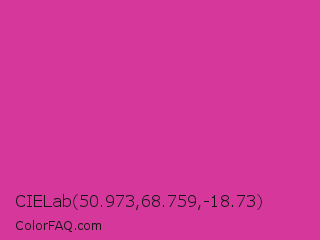 CIELab 50.973,68.759,-18.73 Color is a normal magenta color and the nearest color is Royal Fuchsia #ca2c92. Hex code #d5379b and RGB value is rgb(213,55,155). In RGB color space, this color is composed of 84% red, 22% green, 61% blue, In CMYK color space, this color is composed of 0% cyan, 74% magenta, 27% yellow , 16% black , In HSL color space, this color has a hue angle of 322° , 65% saturation and 53% lightness.