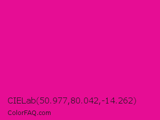 CIELab 50.977,80.042,-14.262 Color is a normal magenta color and the nearest color is Hollywood Cerise #f400a1. Hex code #e60d94 and RGB value is rgb(230,13,148). In RGB color space, this color is composed of 90% red, 5% green, 58% blue, In CMYK color space, this color is composed of 0% cyan, 94% magenta, 36% yellow , 10% black , In HSL color space, this color has a hue angle of 323° , 89% saturation and 48% lightness.