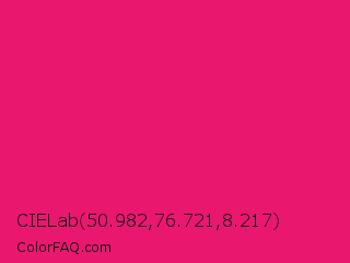 CIELab 50.982,76.721,8.217 Color is a normal rose color and the nearest color is Razzmatazz #e3256b. Hex code #ea176f and RGB value is rgb(234,23,111). In RGB color space, this color is composed of 92% red, 9% green, 44% blue, In CMYK color space, this color is composed of 0% cyan, 90% magenta, 53% yellow , 8% black , In HSL color space, this color has a hue angle of 335° , 83% saturation and 50% lightness.