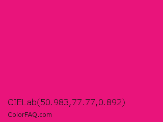 CIELab 50.983,77.77,0.892 Color is a normal rose color and the nearest color is Vivid Cerise #da1d81. Hex code #e9147b and RGB value is rgb(233,20,123). In RGB color space, this color is composed of 91% red, 8% green, 48% blue, In CMYK color space, this color is composed of 0% cyan, 91% magenta, 47% yellow , 9% black , In HSL color space, this color has a hue angle of 331° , 84% saturation and 50% lightness.