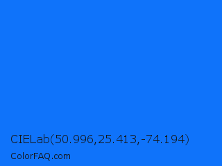CIELab 50.996,25.413,-74.194 Color is a normal blue color and the nearest color is Brandeis Blue #0070ff. Hex code #0f73fa and RGB value is rgb(15,115,250). In RGB color space, this color is composed of 6% red, 45% green, 98% blue, In CMYK color space, this color is composed of 94% cyan, 54% magenta, 0% yellow , 2% black , In HSL color space, this color has a hue angle of 214° , 96% saturation and 52% lightness.