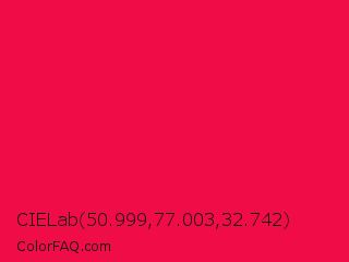 CIELab 50.999,77.003,32.742 Color is a normal red color and the nearest color is Red Ribbon #ed0a3f. Hex code #f00d47 and RGB value is rgb(240,13,71). In RGB color space, this color is composed of 94% red, 5% green, 28% blue, In CMYK color space, this color is composed of 0% cyan, 95% magenta, 70% yellow , 6% black , In HSL color space, this color has a hue angle of 345° , 90% saturation and 50% lightness.