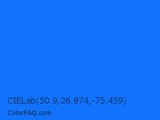 CIELab 50.9,26.874,-75.459 Color is a normal blue color and the nearest color is Blue Crayola #1f75fe. Hex code #1172fc and RGB value is rgb(17,114,252). In RGB color space, this color is composed of 7% red, 45% green, 99% blue, In CMYK color space, this color is composed of 93% cyan, 55% magenta, 0% yellow , 1% black , In HSL color space, this color has a hue angle of 215° , 98% saturation and 53% lightness.
