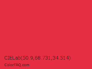 CIELab 50.9,68.731,34.514 Color is a normal red color and the nearest color is Rusty Red #da2c43. Hex code #e62e43 and RGB value is rgb(230,46,67). In RGB color space, this color is composed of 90% red, 18% green, 26% blue, In CMYK color space, this color is composed of 0% cyan, 80% magenta, 71% yellow , 10% black , In HSL color space, this color has a hue angle of 353° , 79% saturation and 54% lightness.