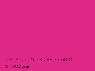 CIELab 50.9,73.088,-6.684 Color is a normal rose color and the nearest color is Barbie Pink #e0218a. Hex code #e02987 and RGB value is rgb(224,41,135). In RGB color space, this color is composed of 88% red, 16% green, 53% blue, In CMYK color space, this color is composed of 0% cyan, 82% magenta, 40% yellow , 12% black , In HSL color space, this color has a hue angle of 329° , 75% saturation and 52% lightness.