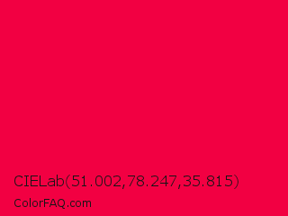 CIELab 51.002,78.247,35.815 Color is a normal rose color and the nearest color is Red Munsell #f2003c. Hex code #f20042 and RGB value is rgb(242,0,66). In RGB color space, this color is composed of 95% red, 0% green, 26% blue, In CMYK color space, this color is composed of 0% cyan, 100% magenta, 73% yellow , 5% black , In HSL color space, this color has a hue angle of 344° , 100% saturation and 47% lightness.