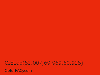 CIELab 51.007,69.969,60.915 Color is a normal red color and the nearest color is Red RYB #fe2712. Hex code #eb290c and RGB value is rgb(235,41,12). In RGB color space, this color is composed of 92% red, 16% green, 5% blue, In CMYK color space, this color is composed of 0% cyan, 83% magenta, 95% yellow , 8% black , In HSL color space, this color has a hue angle of 8° , 90% saturation and 48% lightness.