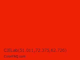 CIELab 51.011,72.375,62.726 Color is a normal red color and the nearest color is Scarlet #ff2400. Hex code #ee2106 and RGB value is rgb(238,33,6). In RGB color space, this color is composed of 93% red, 13% green, 2% blue, In CMYK color space, this color is composed of 0% cyan, 86% magenta, 97% yellow , 7% black , In HSL color space, this color has a hue angle of 7° , 95% saturation and 48% lightness.