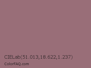 CIELab 51.013,18.622,1.237 Color is a normal red color and the nearest color is Bazaar #98777b. Hex code #996e78 and RGB value is rgb(153,110,120). In RGB color space, this color is composed of 60% red, 43% green, 47% blue, In CMYK color space, this color is composed of 0% cyan, 28% magenta, 22% yellow , 40% black , In HSL color space, this color has a hue angle of 346° , 17% saturation and 52% lightness.