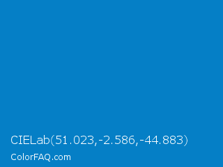 CIELab 51.023,-2.586,-44.883 Color is a normal blue color and the nearest color is Lochmara #007ec7. Hex code #057fc6 and RGB value is rgb(5,127,198). In RGB color space, this color is composed of 2% red, 50% green, 78% blue, In CMYK color space, this color is composed of 97% cyan, 36% magenta, 0% yellow , 22% black , In HSL color space, this color has a hue angle of 202° , 95% saturation and 40% lightness.