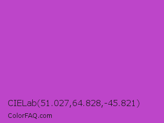 CIELab 51.027,64.828,-45.821 Color is a normal magenta color and the nearest color is Fuchsia Pink #c154c1. Hex code #bd45c9 and RGB value is rgb(189,69,201). In RGB color space, this color is composed of 74% red, 27% green, 79% blue, In CMYK color space, this color is composed of 6% cyan, 66% magenta, 0% yellow , 21% black , In HSL color space, this color has a hue angle of 295° , 55% saturation and 53% lightness.