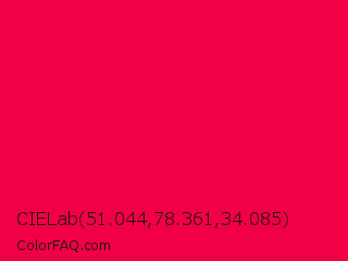CIELab 51.044,78.361,34.085 Color is a normal rose color and the nearest color is Red Munsell #f2003c. Hex code #f20045 and RGB value is rgb(242,0,69). In RGB color space, this color is composed of 95% red, 0% green, 27% blue, In CMYK color space, this color is composed of 0% cyan, 100% magenta, 71% yellow , 5% black , In HSL color space, this color has a hue angle of 343° , 100% saturation and 47% lightness.